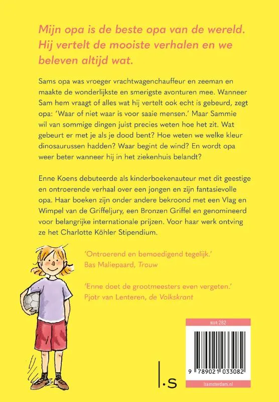 Enne Koens (o.a. Ik ben Vincent en ik ben niet bang en Hotel Bonbien) debuteerde als kinderboekenauteur met Sammie en opa, waarvoor ze een Vlag en Wimpel van de Griffeljury ontving. In dit verhaal over een jongen en zijn fantasievolle opa schrijft Enne in rake zinnen hoe het is om je grootvader en beste vriend te moeten verliezen. De zwart-witillustraties zijn van Kees de Boer, die voor deze uitgave een nieuw omslag maakte.<br> <br> De negenjarige Sam woont vier dagen in de week bij zijn opa en drie dagen bij zijn moeder. Zijn vader heeft hij nooit gekend. Sam vindt het geweldig bij zijn opa, die vroeger vrachtwagenchauffeur en zeeman was en veel mooie verhalen kan vertellen. Wanneer Sam hem vraagt of alles wat hij vertelt ook echt is gebeurd, zegt opa: Waar of niet waar is voor saaie mensen. Maar Sammie wil van sommige dingen precies weten hoe het zit. Wat gebeurt er met je als je dood bent? Hoe weten we welke kleur de dinosaurussen hadden? Waar begint de wind? En wordt opa weer beter wanneer hij in het ziekenhuis belandt?<br> <br> Het boek lees heel vlot, dankzij de korte hoofdstukken, de afwisselende themas en de altijd aanwezige humor. Op het einde van het boek wens je iedereen zon opa toe!<br> Pluizer.be<br> <br> Ontroerend en bemoedigend tegelijk.<br> Bas Maliepaard, Trouw<br> <br> <br>