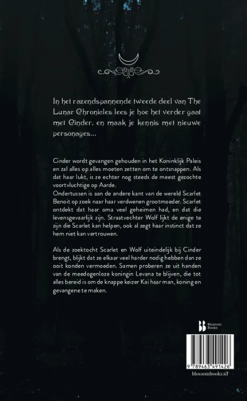 Als de zoektocht van Scarlet en Wolf hen uiteindelijk bij Cinder brengt, blijkt dat ze elkaar veel meer nodig hebben dan ze ooit konden vermoeden. Het is oorlog op Aarde, en koningin Levana is meedogenloos – en op zoek naar hen.