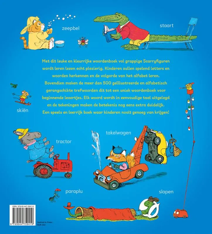 Met dit leuke en kleurrijke woordenboek vol grappige Scarryfiguren wordt leren lezen echt plezierig. Kinderen zullen spelend letters en woorden herkennen en de volgorde van het alfabet leren. Bovendien maken de meer dan 500 geïllustreerde en alfabetisch gerangschikte trefwoorden dit tot een uniek woordenboek voor beginnende lezertjes. Elk woord wordt in eenvoudige taal uitgelegd en de tekeningen maken de betekenis nog eens extra duidelijk. Een speels en leerrijk boek waar kinderen nooit genoeg van krijgen!