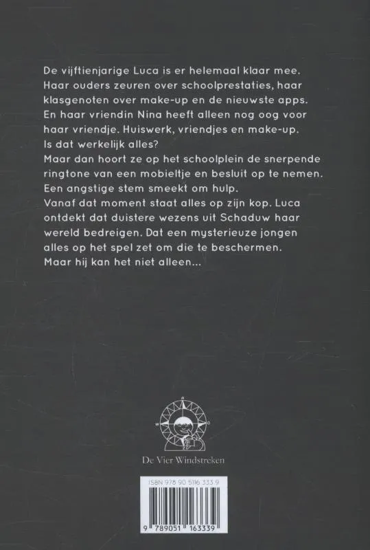 Maar dan hoort ze op het schoolplein de snerpende ringtone van een mobieltje en besluit op te nemen. Een angstige stem smeekt om hulp. Vanaf dat moment staat alles op zijn kop. Luca ontdekt dat duistere wezens uit Schaduw haar wereld bedreigen. Dat een mysterieuze jongen alles op het spel zet om die te beschermen. Maar hij kan het niet alleen…