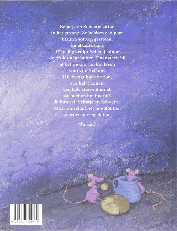 Schatje en Scheetje zitten in het gevang. Ze hebben een paar sokken gestolen. Gelukkig zijn ze samen, maar de muren van hun cel zijn wel erg kaal. Scheetje is lang en dun als een lat; hij kan gemakkelijk door de tralies naar buiten klimmen. Op verzoek van Schatje haalt hij stukje bij beetje de mooiste dingen van buiten naar binnen: de zon, een prachtig uitzicht, bomen en planten, en tot slot zelfs een echte vijver! Schatje en Scheetje hebben het helemaal naar hun zin. Maar dan gebeurt er iets vreselijks…ze worden vrijgelaten!