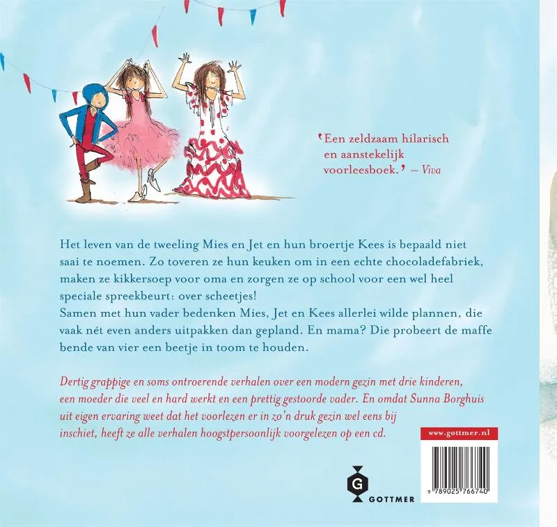 Een lekker dik boek over de bende van vier: tweeling Mies en Jet, hun jongere broertje Kees en hun gekke vader. In dit heerlijk dikke voorleesboek staan maar liefst 30 verhalen. Zo moet Kees bijvoorbeeld een spreekbeurt houden op school, maar hij weet geen leuk onderwerp. Poezen, dino’s – daarover is al honderd keer verteld. Maar dan krijgt papa een van zijn geniale ingevingen: waarom niet een spreekbeurt over scheetjes? Met illustraties van Harmen van Straaten.
