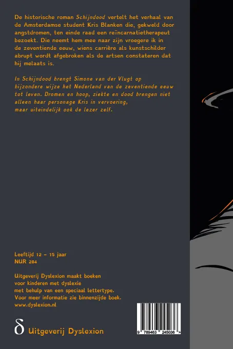 De historische roman Schijndood vertelt het verhaal van de Amsterdamse student Kris Blanken die, gekweld door angstdromen, ten einde raad een reïncarnatietherapeut bezoekt. Die neemt hem mee naar zijn vroegere ik in de zeventiende eeuw, wiens carrière als kunstschilder abrupt wordt afgebroken als de artsen constateren dat hij melaats is.