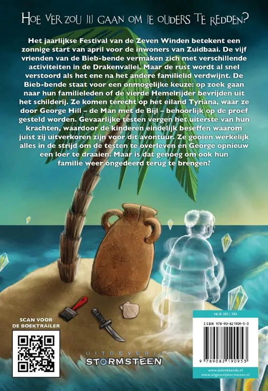 Het jaarlijkse Festival van de Zeven Winden betekent een zonnige start van april voor de inwoners van Zuidbaai. De vijf leden van de Bieb-bende vermaken zich met verschillende activiteiten in de Drakenvallei. Maar de rust wordt al snel verstoord als het ene na het andere familielid verdwijnt. De Bieb-bende staat voor een onmogelijke keuze: op zoek gaan naar hun familieleden of de vierde Hemelrijder bevrijden uit het schilderij. Ze komen terecht op het eiland Tyriana, waar ze door George Hill – de Man met de Bijl – behoorlijk op de proef gesteld worden. Gevaarlijke testen vergen het uiterste van hun krachten, waardoor de kinderen eindelijk beseffen waarom juist zij uitverkoren zijn voor dit avontuur. Ze gooien werkelijk alles in de strijd om de testen te overleven en George opnieuw een loer te draaien. Maar is dat genoeg om ook hun familie weer ongedeerd terug te brengen?