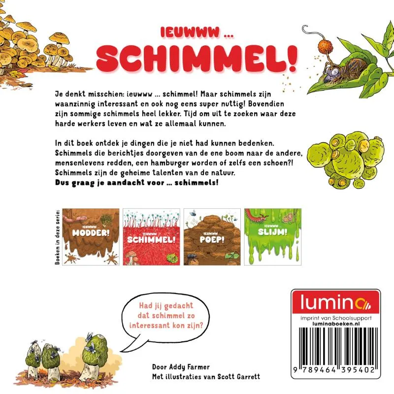 Je denkt misschien: ieuwww … schimmel! Maar schimmels zijn waanzinnig interessant en ook nog eens super nuttig! Bovendien zijn sommige schimmels heel lekker. Tijd om uit te zoeken waar deze harde werkers leven en wat ze allemaal kunnen.In dit boek ontdek je dingen die je niet had kunnen bedenken.Schimmels die berichtjes doorgeven van de ene boom naar de andere, mensenlevens redden, een hamburger worden of zelfs een schoen?! Schimmels zijn de geheime talenten van de natuur.Dus graag je aandacht voor … schimmels!