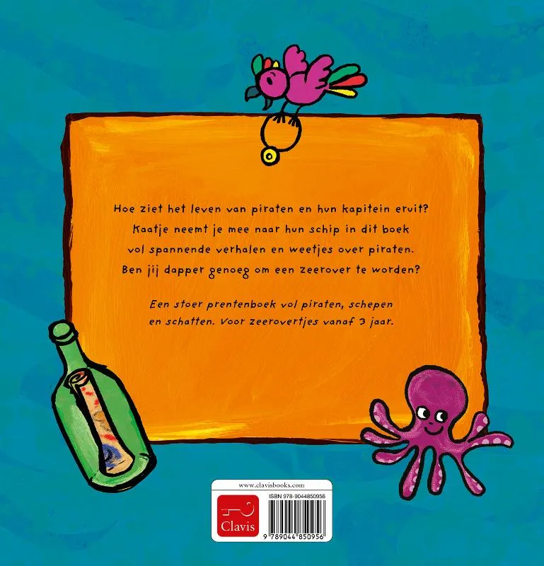 Hoe ziet het leven van piraten en hun kapitein eruit? Kaatje neemt je mee naar hun schip in dit boek vol spannende verhalen en weetjes over piraten. Ben jij dapper genoeg om een zeerover te worden? Een stoer prentenboek vol piraten, schepen en schatten. Voor zeerovertjes vanaf 3 jaar.