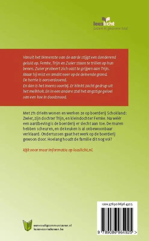 Een Groningse familie lijdt onder de gevolgen van de aardbevingen, waarbij het voortbestaan van de boerderij en de identiteit van de grootvader, dochter en kleindochter bedreigd worden. Verhaal in makkelijke woorden en korte zinnen.
