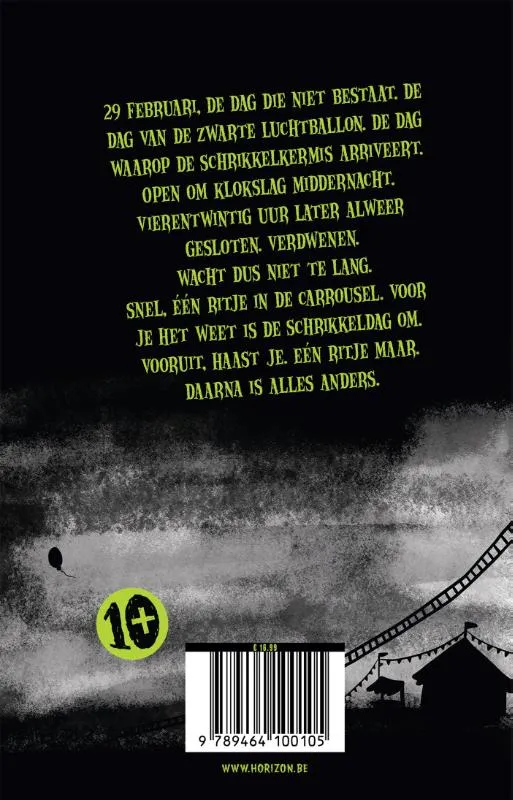 29 februari, de dag die niet bestaat. De dag van de zwarte luchtballon. De dag waarop de Schrikkelkermis arriveert. Open om klokslag middernacht. Vierentwintig uur later alweer gesloten. Verdwenen. Wacht dus niet te lang. <br>Snel, één ritje in de carrousel. Voor je het weet is de schrikkeldag om. Vooruit, haast je. Eén ritje maar. Daarna is alles anders.
