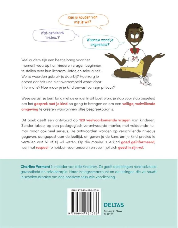 Dit boek geeft een antwoord op 120 veelvoorkomende vragen van kinderen rond seksualiteit. Zonder taboe, op een pedagogisch verantwoorde manier, met voldoende humor maar ook heel serieus. De antwoorden worden op verschillende niveaus gegeven, aangepast aan de leeftijd van het kind, en geven je de kans om je kind precies te vertellen wat hij of zij wil weten. Op die manier is hij of zij goed geïnformeerd, voelt je kind zich goed in zijn vel en leert het respect te hebben voor anderen.
