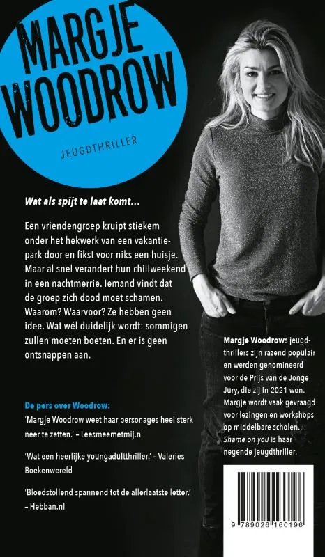 Shame on you is de megaspannende jeugdthriller van Jonge Jury-winnares Margje Woodrow. Bloedstollend tot aan de laatste bladzijdes, inclusief QR-codes: beleef dit verhaal door te lezen, luisteren én kijken. Voor stoere jongens en meiden vanaf 13 jaar. Met politie niet betreden-elastiek.