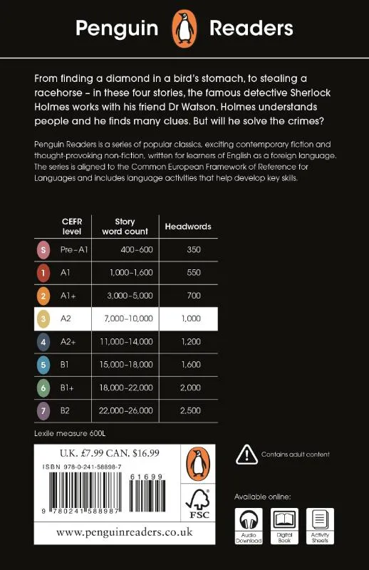 From finding a diamond in a bird’s stomach, to stealing a racehorse – in these four stories, the famous detective Sherlock Holmes works with his friend Dr Watson. Holmes understands people and he finds many clues. But will he solve the crimes?