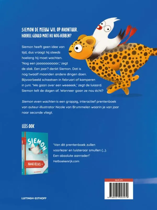 Na Siemon naar rechts van Nicole van Brummelen beleeft Siemon de zeemeeuw een nieuw avontuur. Blader met hem mee van jaar naar seconde in dit interactieve prentenboek waarin kinderen leren omgaan met tijd – en even moeten wachten!<br> <br> Siemon de zeemeeuw en de andere dieren gaan op avontuur. Alleen heeft Siemon geen idee van de tijd. Dus vraagt hij steeds hoelang hij moet wachten. 'Nooooog eeeeen jaaaaar,' zegt de slak. Een jaar? denkt Siemon. Dat is nog vier seizoenen andere dingen doen. 'Nog een week,' zegt de schildpad. Siemon telt de dagen af. 'Morgen,' zegt het luipaard. Nog een nachtje slapen dus. Een uur. Precies tijd genoeg om één keer verstoppertje te spelen. Een minuut. Kan hij mooi wat happen friet eten. Tien seconden. Dan kan hij nog net…<br> Nee, Siemon, we gaan… NU!<br> <br> 'Van dit prentenboek zullen voorlezer en luisteraar smullen (…). Een absolute aanrader!'<br> Hetboekenrijk.com over Siemon naar rechts<br> <br> <br> <br> <br> <br> <br> <br> <br> <br> <br> <br> <br>