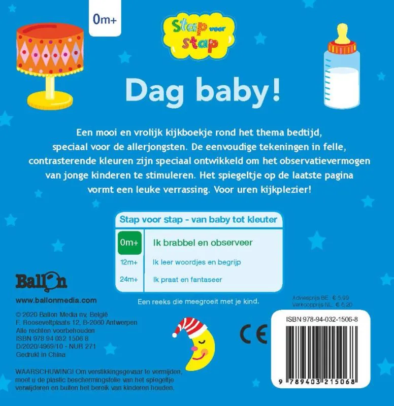 Een mooi en vrolijk kijkboekje rond het thema bedtijd, speciaal voor de allerjongsten. De eenvoudige tekeningen in felle, contrasterende kleuren zijn speciaal ontwikkeld om het observatievermogen van jonge kinderen te stimuleren. Het spiegeltje op de laatste pagina vormt een leuke verrassing. Voor uren kijkplezier!