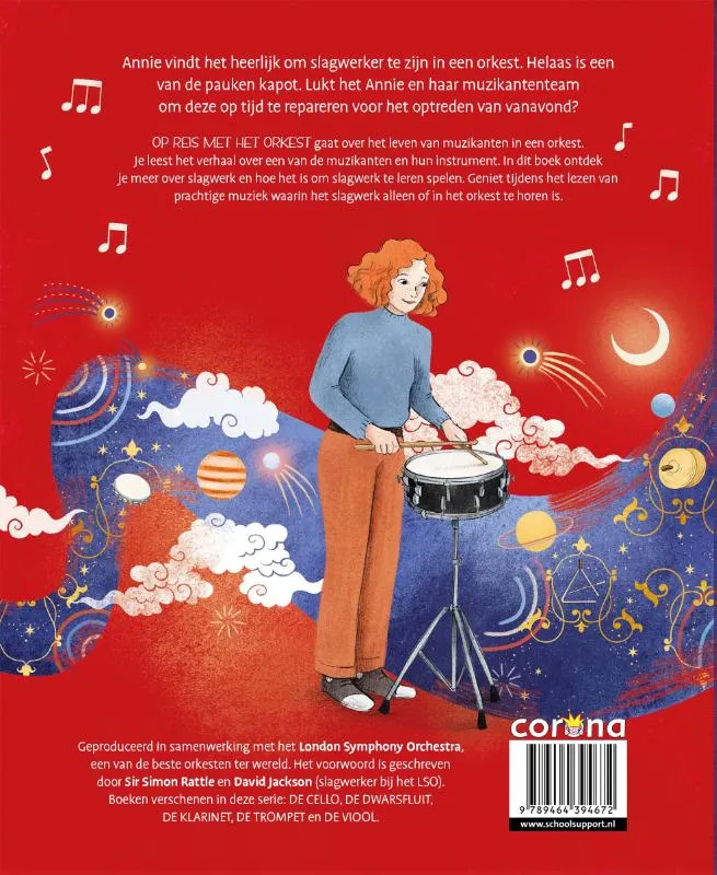‘Op reis met het orkest’ gaat over het leven van muzikanten in een orkest. Je leest het verhaal over een van de muzikanten en hun instrument. In dit boek ontdek je meer over slagwerk en hoe het is om slagwerk te leren spelen. Geniet tijdens het lezen van prachtige muziek waarin het slagwerk in zijn eentje, of in het orkest te horen is.