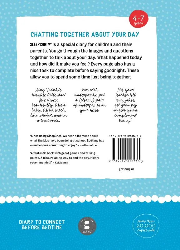 Sleepchat 4+ part one is a special diary for children and their parents to connect before bedtime. You go through the images and questions together to talk about your day. What happened today and how did it make you feel? Every page also has a nice task to complete before saying goodnight. These allow you to spend some time just being together. Suitable for 4 – 7 years.
