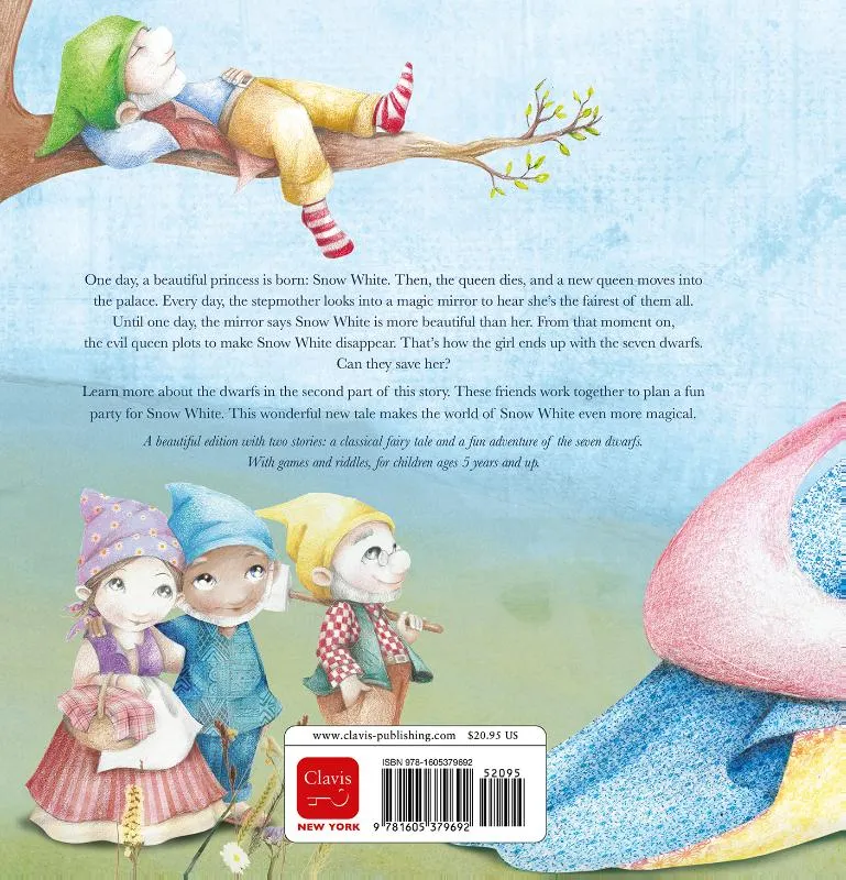 Bundeling van twee verhalen: het klassieke sprookje Sneeuwwitje en een grappig avontuur rond de zeven dwergen. Prentvertelling met illustraties in kleur. Vanaf ca. 5 t/m 8 jaar.