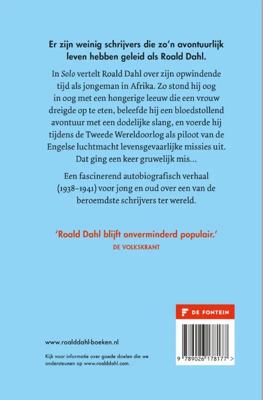 Er zijn weinig schrijvers die zon boeiend en avontuurlijk leven hebben geleid als bestsellerauteur Roald Dahl. In Solo beschrijft hij zijn belevenissen op onweerstaanbare wijze. Een fantastisch autobiografisch verhaal voor jong en oud, met veel foto's, brieven en dagboekfragmenten.<br> <br> In Solo vertelt Roald Dahl met humor over zijn opwindende tijd in Oost-Afrika aan het eind van de jaren dertig en zijn ongelooflijke belevenissen als piloot bij de Engelse luchtmacht tijdens de Tweede Wereldoorlog.<br> <br> Roald Dahl schreef talloze bekroonde boeken, zowel voor kinderen als voor volwassenen. Solo geeft een uniek inkijkje in de jonge jaren van deze meesterverteller.<br> <br> 'Roald Dahl blijft onverminderd populair.' – DE VOLKSKRANT<br> <br>