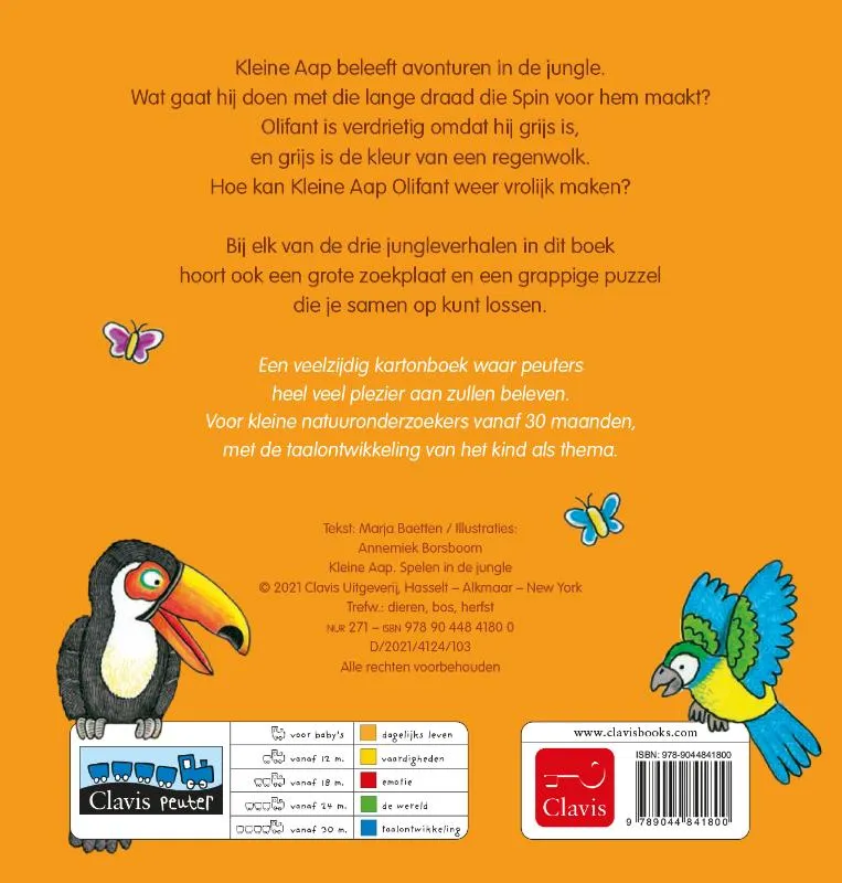 Kleine Aap beleeft avonturen in de jungle. Wat gaat hij doen met die lange draad die Spin voor hem maakt? Olifant is verdrietig omdat hij grijs is, en grijs is de kleur van een regenwolk. Hoe kan Kleine Aap Olifant weer vrolijk maken?