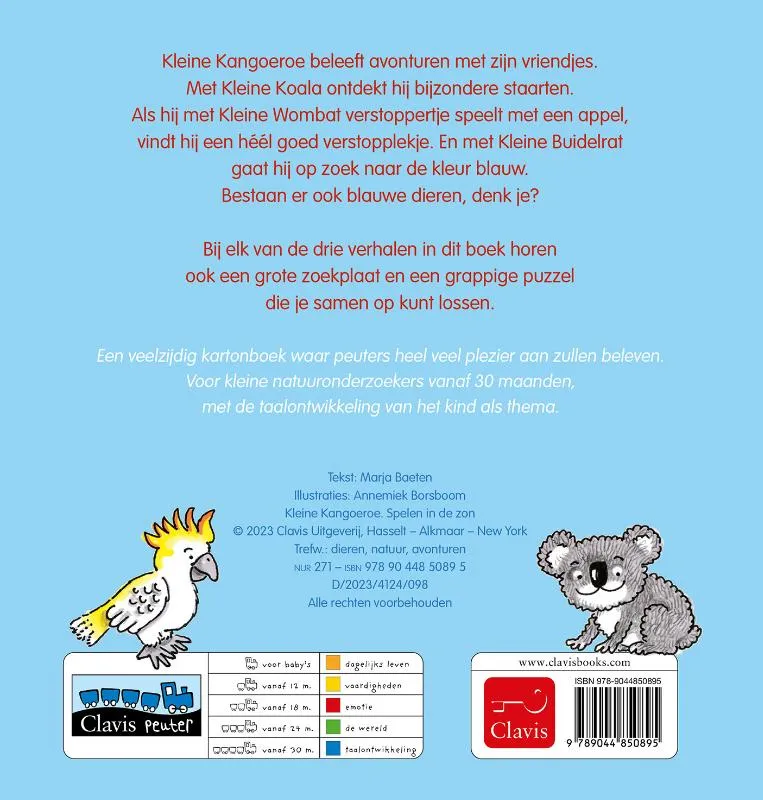 Kleine Kangoeroe beleeft avonturen met zijn vriendjes. Met Kleine Koala ontdekt hij bijzondere staarten. Als hij met Kleine Wombat verstoppertje speelt met een appel, vindt hij een héél goed verstopplekje. En met Kleine Buidelrat gaat hij op zoek naar de kleur blauw. Bestaan er ook blauwe dieren, denk je? Bij elk van de drie verhalen in dit boek horen ook een grote zoekplaat en een grappige puzzel die je samen op kunt lossen. Een veelzijdig kartonboek waar peuters heel veel plezier aan zullen beleven. Voor kleine natuuronderzoekers vanaf 30 maanden, met de taalontwikkeling van het kind als thema.