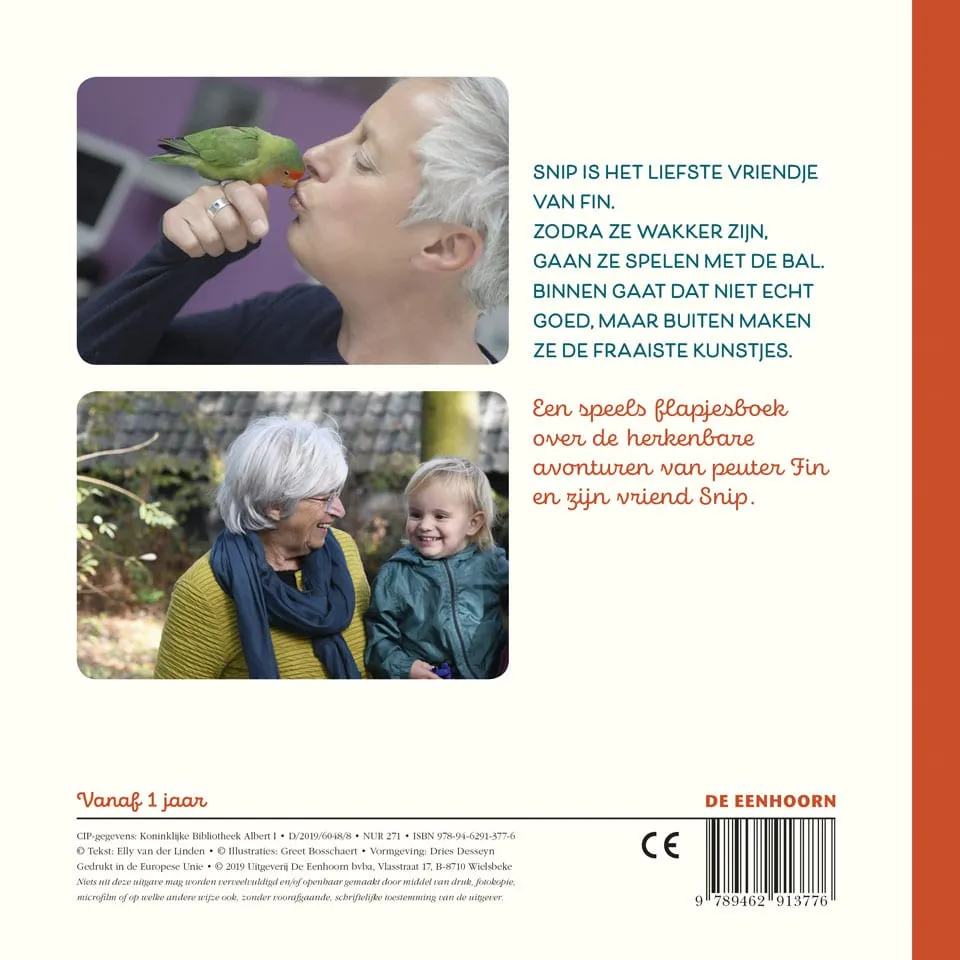 De grote vriend van Fin is Snip, een kleurrijke papegaai. Ze spelen elke dag met elkaar van opstaan tot slapengaan. Snip is een slimme, maar een wat ondeugende papegaai. Fin doet vrolijk met hem mee. In dit boekje spelen Fin en Snip met een bal. Binnen gaat dat niet echt goed maar buiten maken ze de fraaiste kunstjes. Doe dat maar eens na!