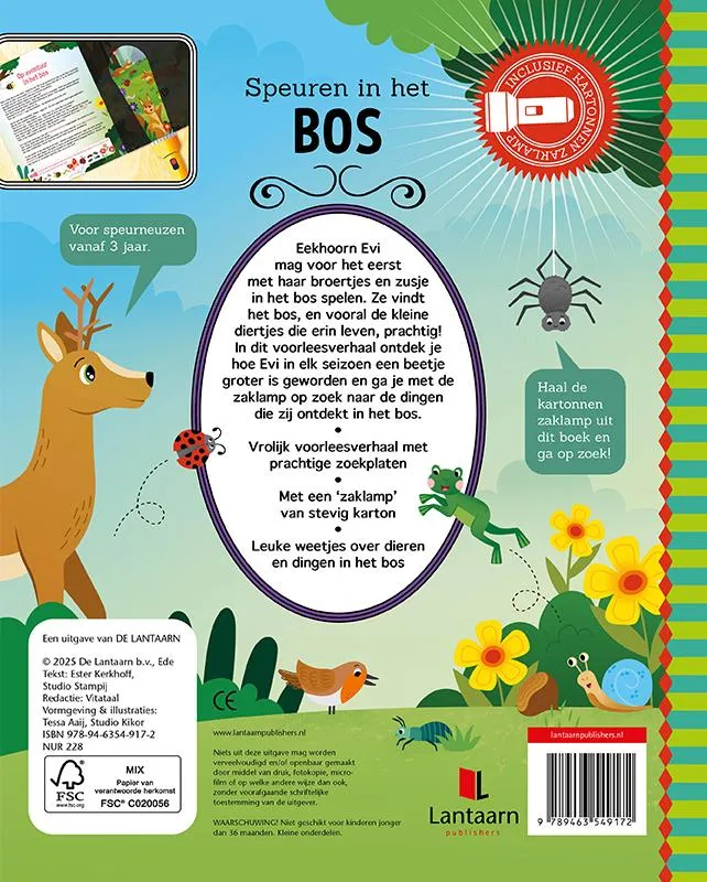 Het boek begint met leuke weetjes en feitjes over het bos. Hier kom je ook de kartonnen zaklamp tegen. Deze zaklamp heb je nodig voor de pagina’s die volgen. In het verhaal staan namelijk gekleurde woorden, die je op de rechterpagina kunt zoeken. Maar dat lukt alleen als je de zaklamp gebruikt! Schuif ‘m onder de zwarte pagina en je ziet dat er een lichtbundel ontstaat, waarmee je kunt zien wat Evi allemaal tijdens haar reis tegenkomt. Bekijk je ook de andere titels in deze serie?”