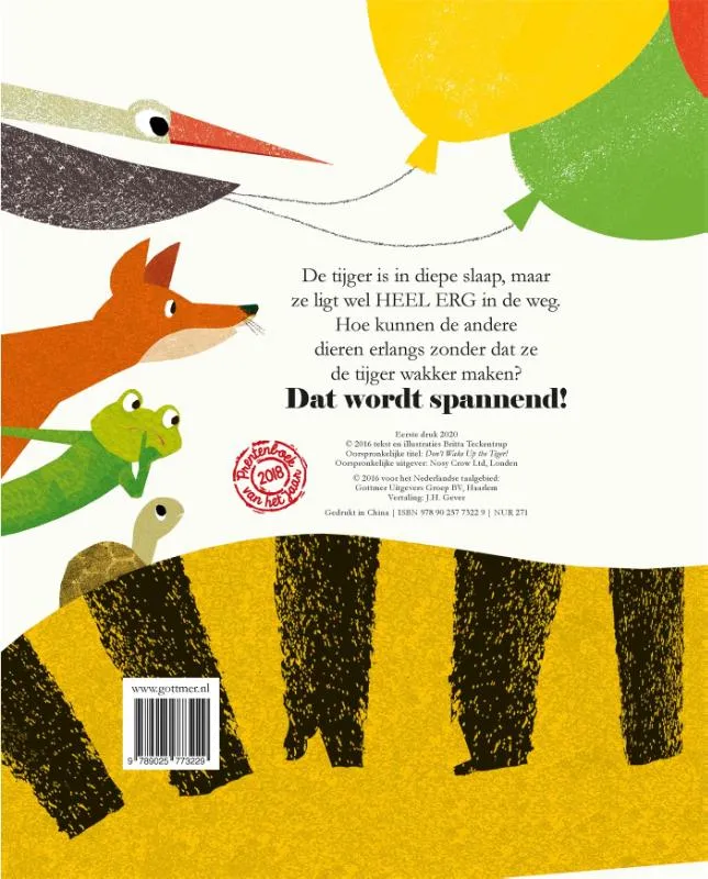 Inmiddels is ‘Ssst! De tijger slaapt’ een ware klassieker te noemen. Deze uitvoering van het Prentenboek van het Jaar 2018 is een stevig kartonboekje.Ssst! De tijger slaapt en niemand wil haar wakker maken. Er is alleen een probleem: ze ligt vreselijk in de weg. Hoe moeten de dieren er nu langs? De slimme kikker komt met de oplossing. Ballonnen! Alle dieren zweven een voor een over de slapende tijger heen. Maar de lezer moet ze helpen! Door te aaien of te blazen zweven alle dieren veilig naar de overkant. Verkozen tot Prentenboek van het jaar 2018.