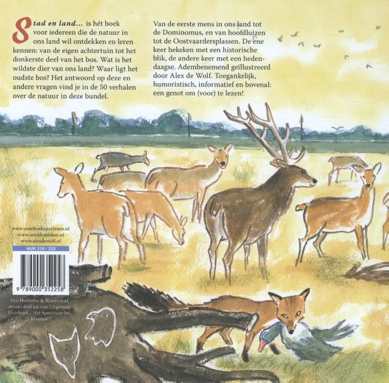 Stad en land… is hét (voor)leesboek voor iedereen die de vele verschijningsvormen van de natuur in ons land wil ontdekken en leren kennen: van de eigen achtertuin tot het diepste puntje van het bos. Wat is het wildste dier van ons land? Wat is de meest getelde vogel? Wat is het oudste bos? Het antwoord op deze en andere vragen vind je in de 50 verhalen over de natuur in deze bundel. Van de eerste mens in ons land tot de dominomus en van haarluizen tot de Oostvaardersplassen. De ene keer bekeken met een historische blik, de andere keer met een hedendaagse. Opnieuw adembenemend geïllustreerd door Alex de Wolf. Toegankelijk, humoristisch, informatief en bovenal: een genot om (voor) te lezen!