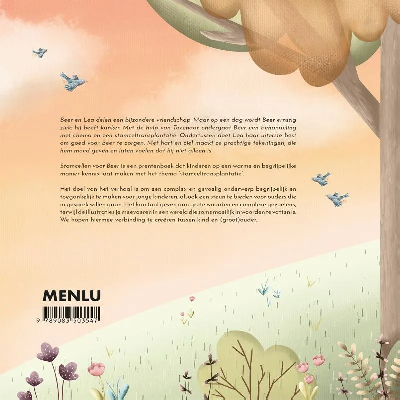 Beer en Lea delen een bijzondere vriendschap. Maar op een dag wordt Beer ernstig ziek:hij heeft kanker. Met de hulp van Tovenaar, ondergaat Beer een behandeling met chemoen een stamceltransplantatie. Ondertussen doet Lea haar uiterste best om goed voorBeer te zorgen. Met hart en ziel maakt ze prachtige tekeningen, die hem moed geven enlaten voelen dat hij niet alleen is.‘Stamcellen voor Beer’ is een prentenboek dat kinderen op een warme en begrijpelijkemanier kennis laat maken met het thema ‘stamceltransplantatie’.Het doel van het verhaal is om een complex en gevoelig onderwerp begrijpelijk entoegankelijk te maken voor jonge kinderen, alsook een steun te bieden voor ouders die ingesprek willen gaan. Het kan taal geven aan grote woorden en complexe gevoelens,terwijl de illustraties je meevoeren in een wereld die soms moeilijk in woorden te vattenis. We hopen hiermee verbinding te creëren tussen kind en (groot)ouder.