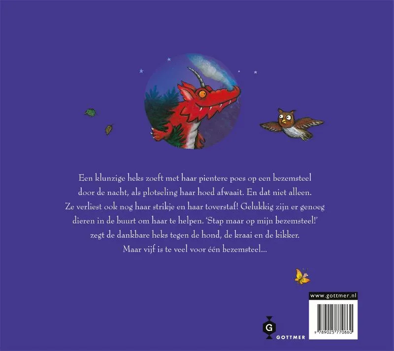 Een klunzige heks op haar bezem laat steeds iets vallen. Haar hoed bijvoorbeeld, maar ook haar toverstok! Alle dieren die haar helpen mogen met haar mee. Maar vijf is veel te veel voor één bezemsteel! Een grappig prentenboekverhaal op rijm.