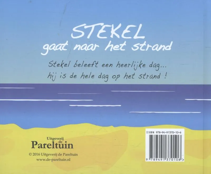 Stekel gaat met zijn vader en moeder naar het strand. Hij speelt in zee, bouwt een zandkasteel, speelt met zijn vlieger en eet een ijsje. Wat een geweldige dag! Oblong prentenboek met eenvoudige, vrolijk gekleurde illustraties en tekst op rijm. Vanaf ca. 3 jaar.