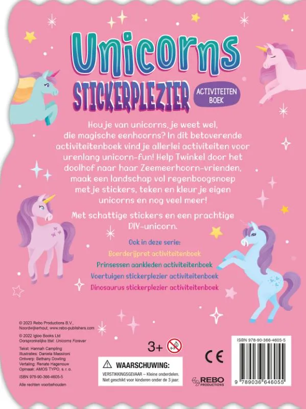 Hou je van unicorns, je weet wel, die magische eenhoorns? In dit betoverende activiteitenboek vind je allerlei activiteiten voor urenlang unicorn-fun! Help Twinkel door het doolhof naar haar Zeemeerhoorn-vrienden, maak een landschap vol regenboogsnoep met je stickers, teken en kleur je eigen unicorns en nog veel meer! Met schattige stickers en een prachtige DIY-unicorn.