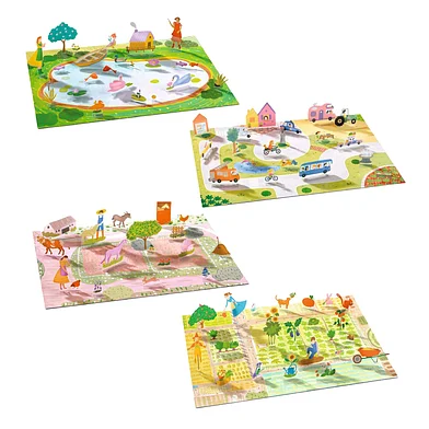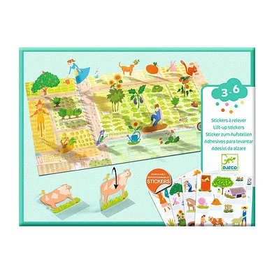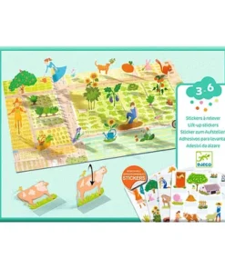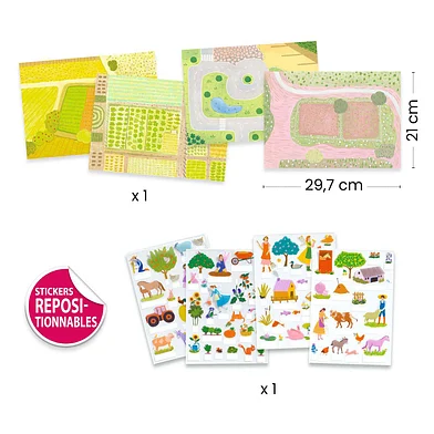 Kinderen plakken de kleurrijke boerderij stickers op de grote afbeeldingen en zetten die dan één voor één rechtop. Zo maken ze 3D scenes en eindeloze verhalen!