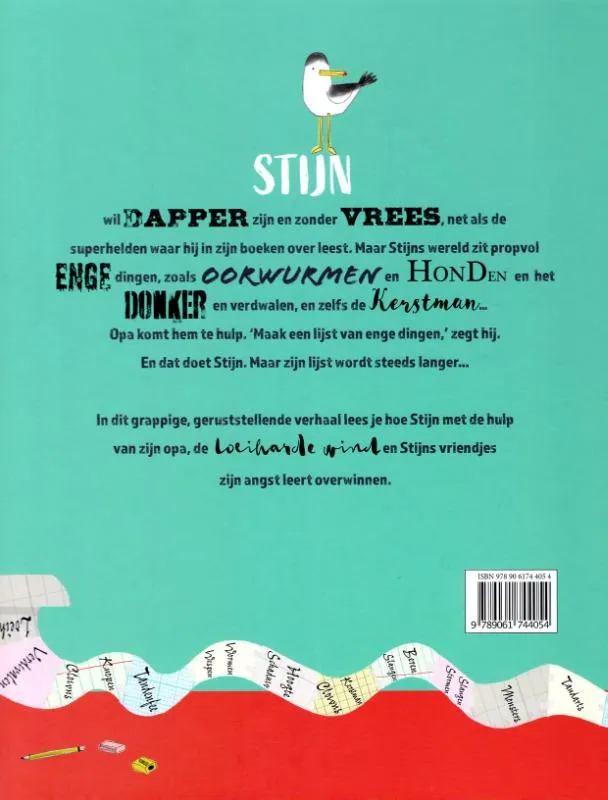 Opa komt hem te hulp^. ‘Maak een lijst van enge dingen,’ zegt hij. En dat doet Stijn. Maar zijn lijst wordt steeds langer…