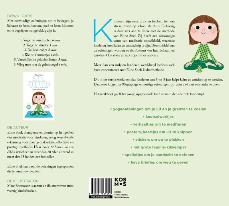 Eline Snel komt na ‘Stilzitten als een kikker’ met een follow-up: het ‘Werkboek stilzitten als een kikker’. Dit is het eerste werkboek voor kinderen van 5 tot 8 jaar om zich te concentreren door middel van de methode van de kikker. Het bevat 80 grappige en nuttige activiteiten om alleen of met een ouder te doen om rust en stilte te vinden.
