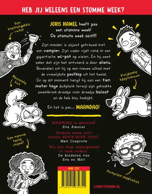 Heb jij ooit een slechte week gehad? Joris Hamel wel. Zijn moeder is net getrouwd met een vampier. Zijn vader rijdt in een auto die op een gigantisch toilet op wielen lijkt. Zijn kat is hoogstwaarschijnlijk ontvoerd door aliens. Op de eerste dag van zijn nieuwe school wordt hij meteen al gepest. En tot overmaat van ramp bungelt hij aan een 10 meter hoge duikplank terwijl zijn gebreide zwembroek langzaam ontrafelt terwijl de hele klas toekijkt. En het is pas… MAANDAG!