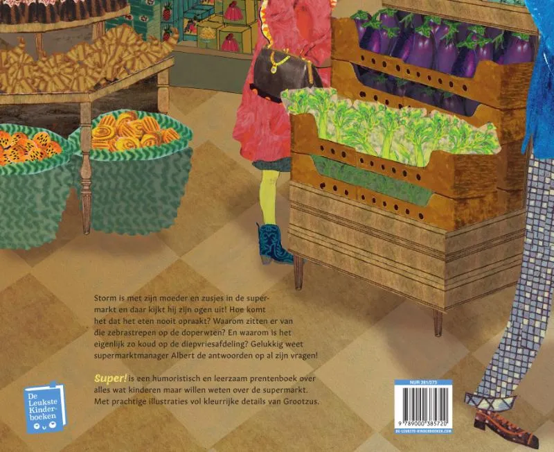 Super! is een grappig en leerzaam prentenboek over alles wat kinderen maar willen weten over de supermarkt. Met prachtige illustraties vol kleurrijke details van Grootzus. Geschikt om voor te lezen aan nieuwsgierige kinderen vanaf 4 jaar.