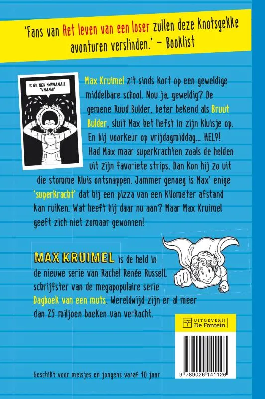 Max Kruimel zit sinds kort op een geweldige middelbare school. Nou ja, geweldig? Ruud Bulder, beter bekend als Bruut Bulder, wil niets liever dan Max in zijn kluisje opsluiten. En dat doet hij! Op vrijdagmiddag met het weekend voor de deur…<br>Had Max maar superkrachten zoals de helden uit zijn stripboeken, dan kon hij uit die stomme kluis ontsnappen. Helaas is zijn enige talent dat hij pizza’s van een kilometer afstand kan ruiken. Maar Max Kruimel geeft zich niet zomaar gewonnen.