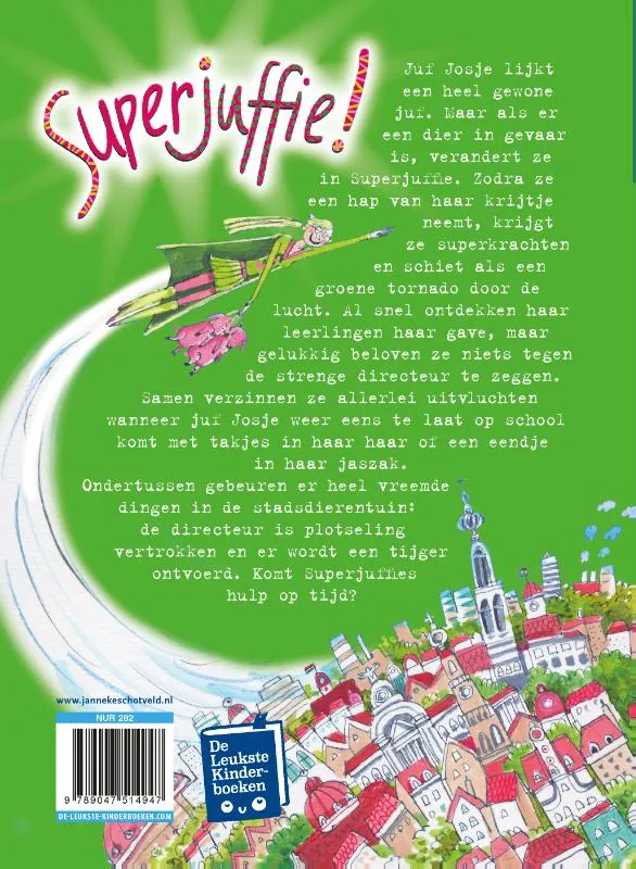 Juf Josje lijkt een heel gewone juf, maar er is iets bijzonders met haar aan de hand: als er een dier in nood is, verandert ze in Superjuffie! Zodra ze een hap van haar krijtje neemt, krijgt ze superkrachten en schiet ze als een groene tornado door de lucht om het dier te redden. Juf Josje probeert haar gave te verbergen voor de kinderen op haar nieuwe school, maar dat lukt niet lang. Gelukkig beloven ze niets te vertellen tegen de strenge directeur. Samen verzinnen ze steeds allerlei uitvluchten als juf Josje weer eens te laat op school komt met takjes in haar haar of een eendje in haar jaszak. Ondertussen gebeuren er heel vreemde dingen in de stadsdierentuin. Lukt het Superjuffie en de kinderen om de dierentuin van de ondergang te redden? Een sprankelend boek vol humor en fantasie!