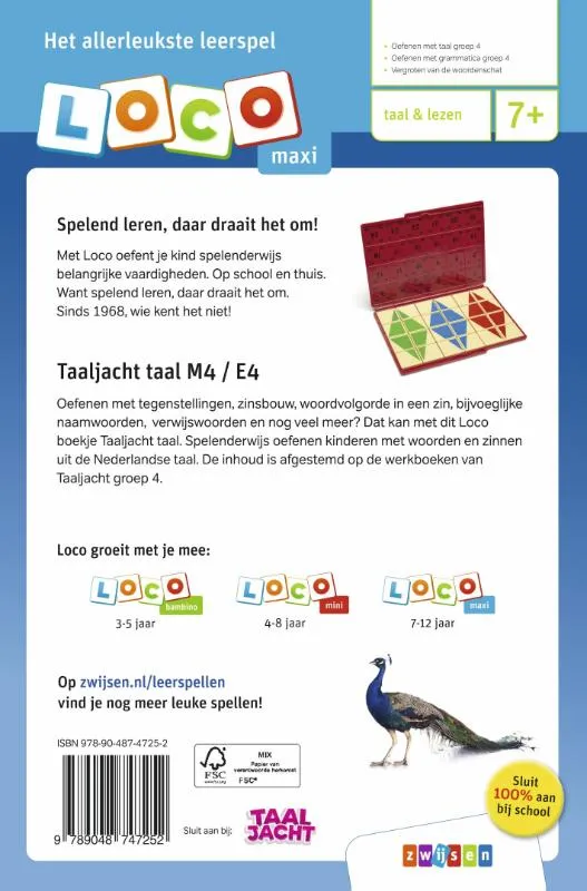 Oefenen met tegenstellingen, vraagzinnen, woordvolgorde in een zin, bijvoeglijke naamwoorden, verwijswoorden en nog veel meer? Dat kan met dit Loco boekje Taaljacht taal. Spelenderwijs oefenen kinderen met woorden en zinnen uit de Nederlandse taal. De inhoud is afgestemd op de werkboeken van Taaljacht groep 4.<br><br>Dit oefenboekje is te gebruiken bij de Loco maxi basisdoos.<br><br>Leerdoelen:<br>• Oefenen met taal en spellingsmoeilijkheden groep 4<br>• Vergroten van de woordenschat<br><br>Met het zelfcorrigerende Loco oefent een kind spelenderwijs belangrijke vaardigheden. Op school en thuis. Want spelend leren, daar draait het om. Sinds 1968, wie kent het niet!