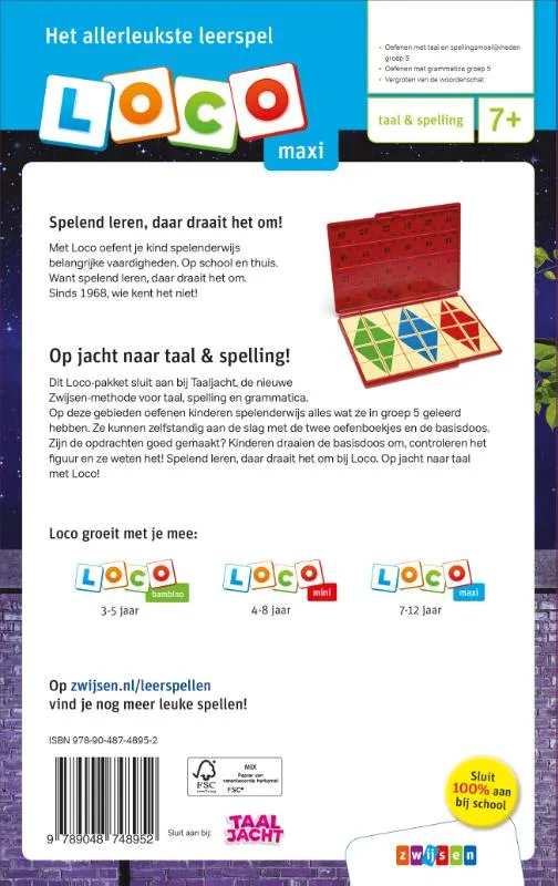 Dit Loco maxi pakket sluit aan bij Taaljacht, dé Zwijsen-methode voor taal, spelling en grammatica. Op deze gebieden oefenen kinderen spelenderwijs alles wat ze in groep 5 geleerd hebben. Zijn de opdrachten goed gemaakt? Kinderen draaien de basisdoos om, controleren het figuur en ze weten het! Spelend leren, daar draait het om bij Loco. Op jacht naar taal met Loco!