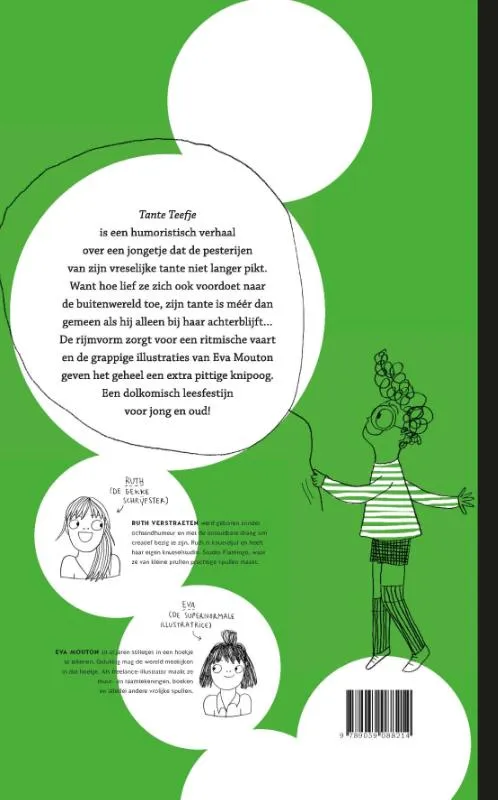 Tante Teefje is een humoristisch verhaal over een jongetje dat de pesterijen van zijn vreselijke tante niet langer pikt. Want hoe lief ze zich ook voordoet naar de buitenwereld toe, zijn tante is méér dan gemeen als hij alleen bij haar achterblijft… De rijmvorm zorgt voor een ritmische vaart en de grappige illustraties van Eva Mouton geven het geheel een extra pittige knipoog. Een dolkomisch leesfestijn voor jong en oud!