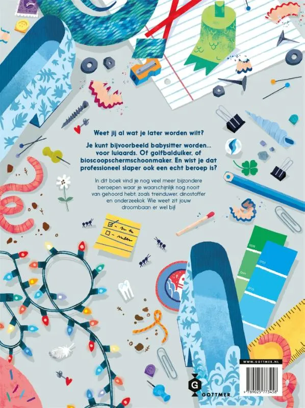 Te gekke beroepen die echt bestaan Als kinderen bedenken wat ze later willen worden, denken ze vaak aan beroepen als dokter, boer of piloot. Maar wist je dat je bijvoorbeeld ook professioneel slaper kan worden, of bioscoopschermschoonmaker, of golfbalduiker? In dit fraai geïllustreerde boek duikt Natalie Labarre in de wereld van de maffe, ongebruikelijke, onbekende of onderbelichte beroepen en legt ze uit waarom ze zo bijzonder zijn en misschien wel helemaal niet zo makkelijk als je denkt!