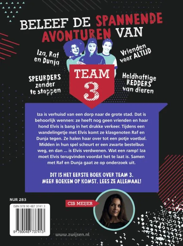 Spannende detectiveserie Team 3 van thrillerauteur Cis Meijer voor kinderen vanaf 9 jaar. Dit is het eerste boek uit de serie. Beleef alle avonturen van Raf, Dunja en Iza. In De geheime test is Iza net verhuisd naar de grote stad. Ze heeft nog geen vrienden. Tijdens een wandeling met haar hond Elvis komt ze klasgenoten Raf en Dunja tegen. Ze halen haar over tot een potje voetbal. Midden in hun spel scheurt een zwarte bestelbus weg, en dan … is Elvis verdwenen. Wat een ramp! Iza moet Elvis terugvinden voordat het te laat is. Samen met Raf en Dunja gaat ze op onderzoek uit!