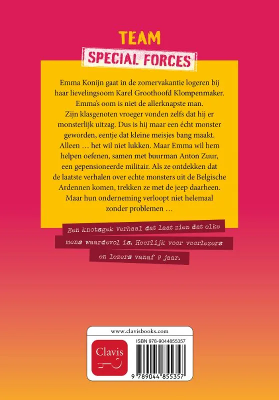 Emma Konijn gaat in de zomervakantie logeren bij haar lievelingsoom Karel Groothoofd Klompenmaker. Emma’s oom is niet de allerknapste man. Zijn klasgenoten vroeger vonden zelfs dat hij er monsterlijk uitzag. Dus is hij maar een écht monster geworden, eentje dat kleine meisjes bang maakt. Alleen … het wil niet lukken. Maar Emma wil hem helpen oefenen, samen met buurman Anton Zuur, een gepensioneerde militair. Als ze ontdekken dat de laatste verhalen over echte monsters uit de Belgische Ardennen komen, trekken ze met de jeep daarheen. Maar hun onderneming verloopt niet helemaal zonder problemen …