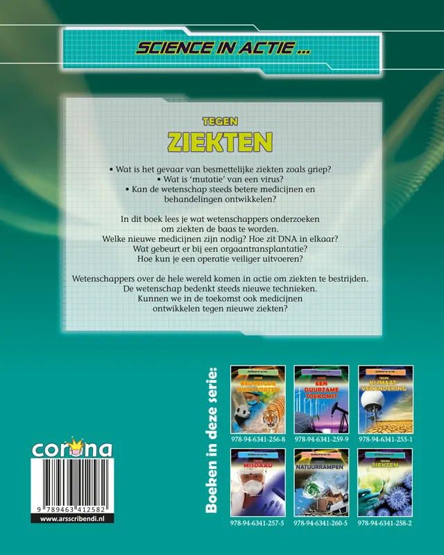 In dit boek lees je wat wetenschappers onderzoeken om ziekten de baas te worden. Welke nieuwe medicijnen zijn nodig? Hoe zit DNA in elkaar? Wat gebeurt er bij een orgaantransplantatie? Hoe kun je een operatie veiliger uitvoeren? Wetenschappers over de hele wereld komen in actie om ziekten te bestrijden. De wetenschap bedenkt steeds nieuwe technieken. Kunnen we in de toekomst ook medicijnen ontwikkelen tegen nieuwe ziekten?