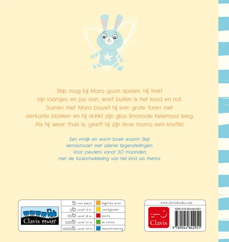 Een vrolijk en warm boek waarin Skip kennismaakt met allerlei tegenstellingen. Voor peuters vanaf 30 maanden, met de taalontwikkeling van het kind als thema.