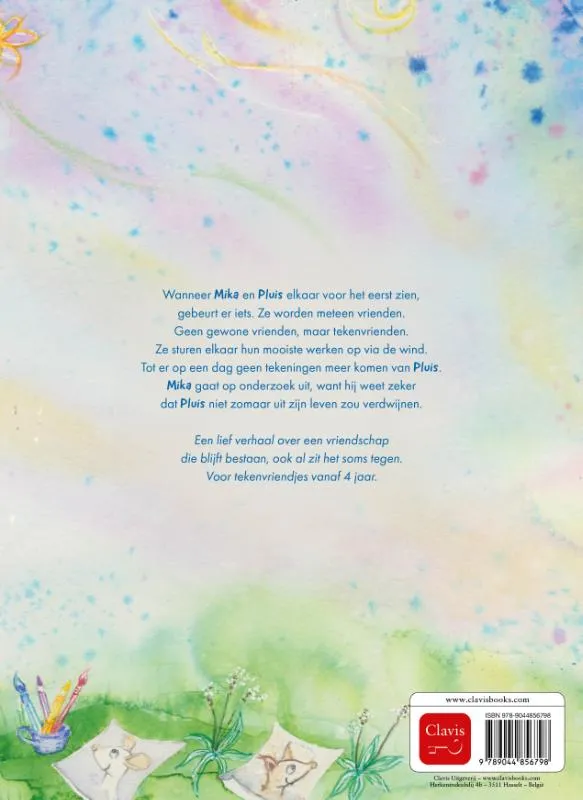 Wanneer Mika en Pluis elkaar voor het eerst zien, gebeurt er iets. Ze worden meteen vrienden. Geen gewone vrienden, maar tekenvrienden. Ze sturen elkaar hun mooiste werken op via de wind. Maar op een dag komen er geen tekeningen meer van Pluis. Mika gaat op onderzoek uit, want hij weet zeker dat Pluis niet zomaar uit zijn leven zou verdwijnen.Een lief verhaal over een vriendschap die blijft bestaan, ook al zit het soms tegen. Voor tekenvriendjes vanaf 4 jaar.