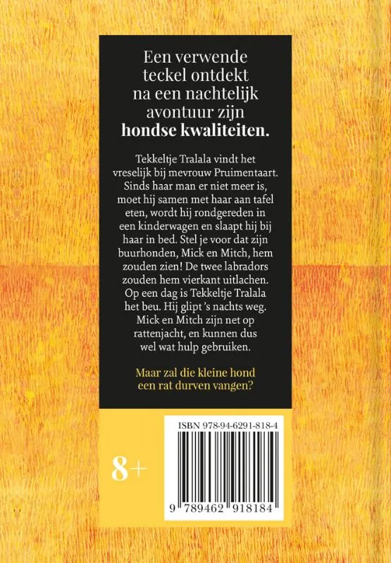 Tekkeltje Tralala vindt het vreselijk bij mevrouw Pruimentaart. Sinds haar man er niet meer is, moet hij samen met haar aan tafel eten, wordt hij rondgereden in een kinderwagen en slaapt hij bij haar in bed. Stel je voor dat zijn buurhonden, Mick en Mitch, hem zouden zien! De twee labradors zouden hem vierkant uitlachen. Op een dag is Tekkeltje Tralala het beu. Hij glipt ’s nachts weg. Mick en Mitch zijn net op rattenjacht, en kunnen dus wel wat hulp gebruiken. Maar zal die kleine hond een rat durven vangen?