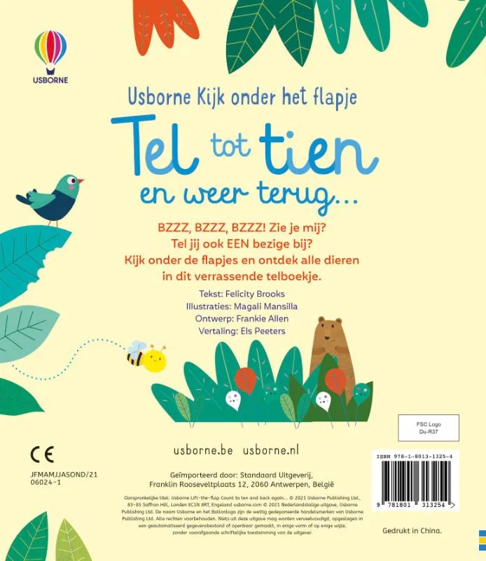 Kleine kinderen leren met dit kartonboek tot tien te tellen en vinden een bezige bij, twee kwakende kikkers, drie vlugge vissen en nog veel meer dieren.