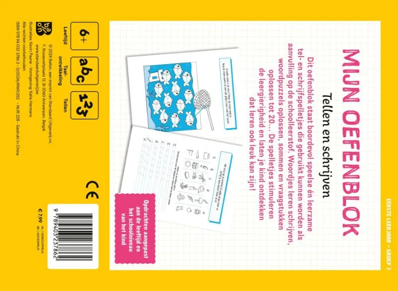 Dit oefenblok staat boordevol speelse én leerzame tel- en schrijfspelletjes die gebruikt kunnen worden als aanvulling op de schoolleerstof. Woordjes leren schrijven, woordpuzzels oplossen, sommen en vraagstukken oplossen tot 20… De spelletjes stimuleren de leergierigheid en laten je kind ontdekken dat leren ook leuk kan zijn!